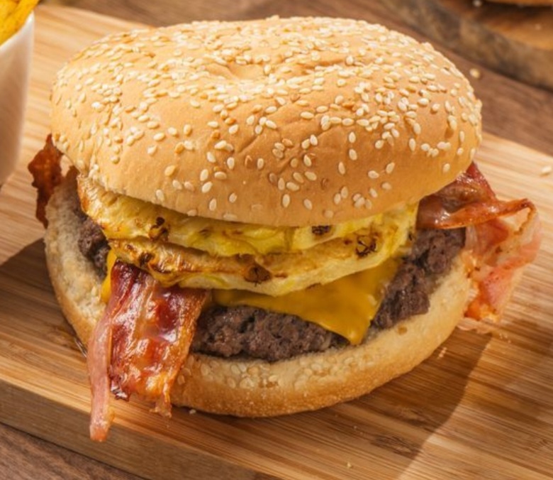 Hamburguesa acompañada de queso cheedar, cebolla caramelizada, piña caramelizada, tocino , pepinillos y salsa Siroy. Acompañada de papas fritas